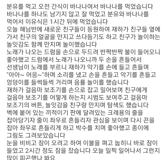 | 11개월 아기 어린이집 활동일지 -키즈노트 (0) | 2022.05.19 |